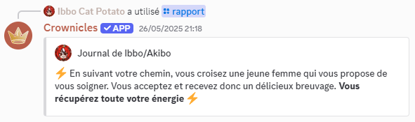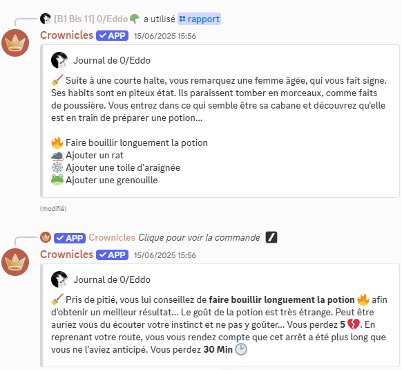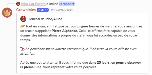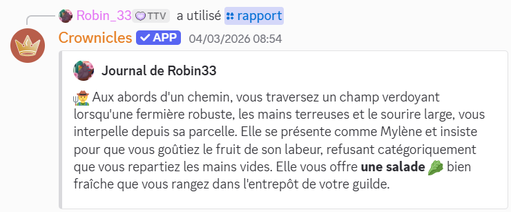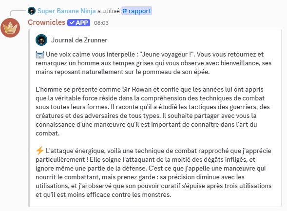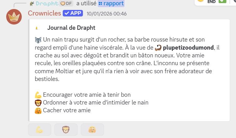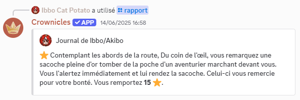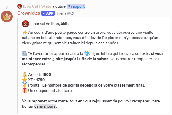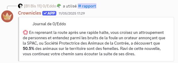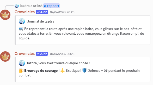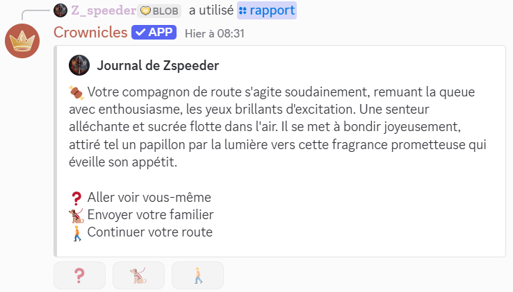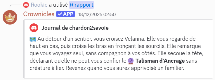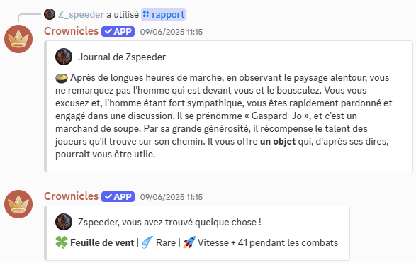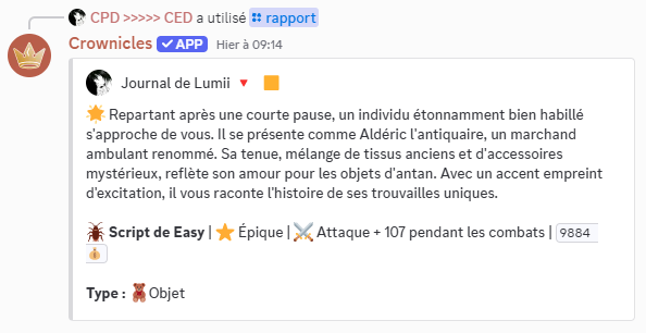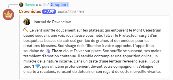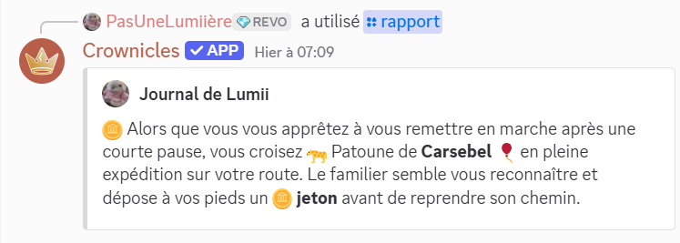<picture><source srcset="https://2159345893-files.gitbook.io/~/files/v0/b/gitbook-x-prod.appspot.com/o/spaces%2F-MH1fCvNZ7zikrWd7dJj-2584506019%2Fuploads%2FuZH0xaHWmLUlqpZMoljj%2FCapture%20d&#x27;%C3%A9cran%202025-06-19%20191320.png?alt=media&#x26;token=247999d8-40d2-4707-9416-2b666ec540dd" media="(prefers-color-scheme: dark)"><img src="https://2159345893-files.gitbook.io/~/files/v0/b/gitbook-x-prod.appspot.com/o/spaces%2F-MH1fCvNZ7zikrWd7dJj-2584506019%2Fuploads%2FgnxK0alzkTRPwQeble5f%2FCapture%20d&#x27;%C3%A9cran%202025-06-19%20191334.png?alt=media&#x26;token=e6c5a8c9-cdf0-43af-bc12-ef31a874c1e2" alt="Un exemple de rapport où le joueur trouve un familier."></picture>