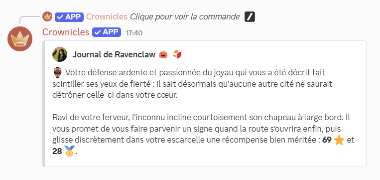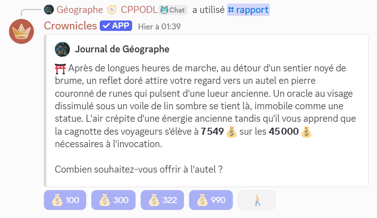 Lors de ce mini-événement, un oracle vous fera comprendre qu'un don dans sa cagnotte sera le bienvenu pour déclencher une [bénédiction](https://guide.crownicles.com/notions-avancees/benedictions).