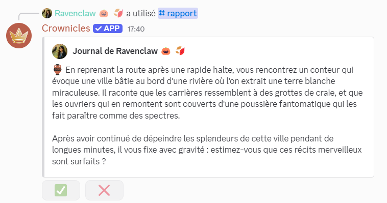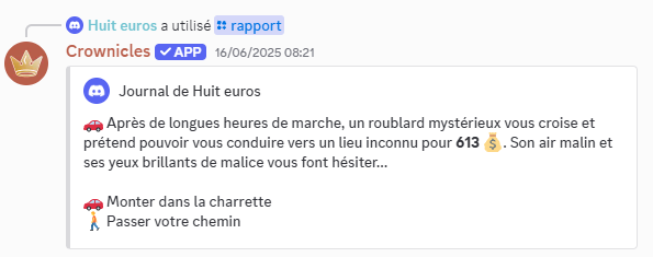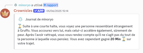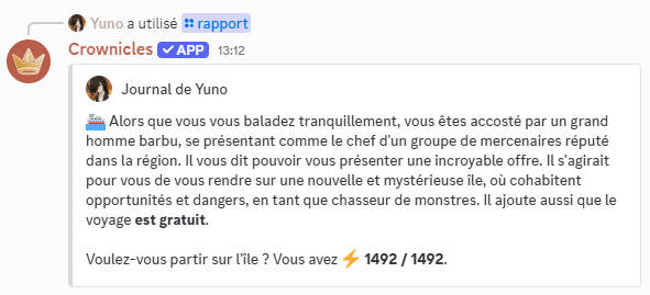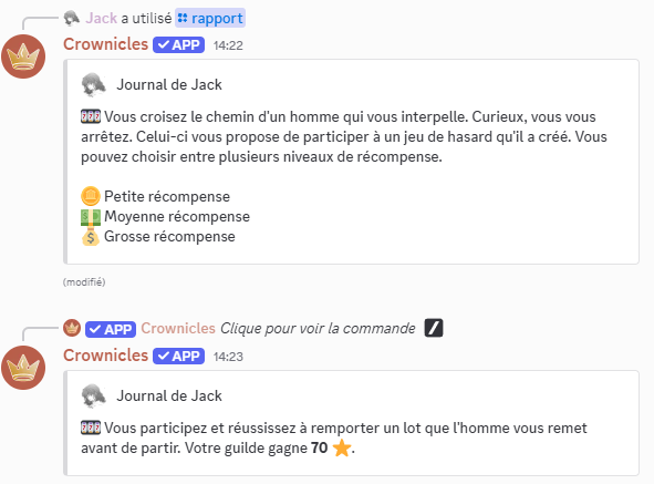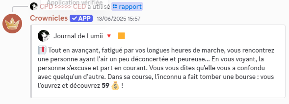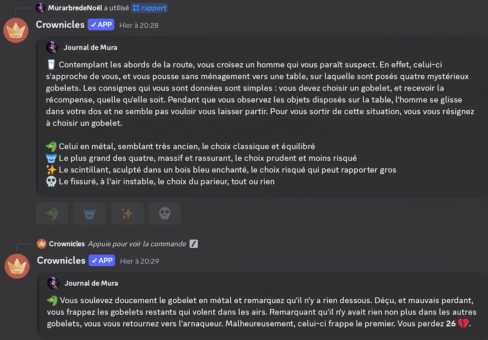 <picture><source srcset="https://2159345893-files.gitbook.io/~/files/v0/b/gitbook-x-prod.appspot.com/o/spaces%2F-MH1fCvNZ7zikrWd7dJj-2584506019%2Fuploads%2FPQ49uRIincxFdZcoKBU4%2FCapture%20d&#x27;%C3%A9cran%202025-06-19%20191537.png?alt=media&#x26;token=f2a094a8-24f5-4df5-980a-b85e134d98f8" media="(prefers-color-scheme: dark)"><img src="https://2159345893-files.gitbook.io/~/files/v0/b/gitbook-x-prod.appspot.com/o/spaces%2F-MH1fCvNZ7zikrWd7dJj-2584506019%2Fuploads%2FqAye7gcFaykcpyTcSfgX%2FCapture%20d&#x27;%C3%A9cran%202025-06-19%20191547.png?alt=media&#x26;token=587692b6-25d9-44e9-8e1d-4486a5932b02" alt="Un exemple du mini-évènement &#x22;Rien ne se passe&#x22;"></picture>